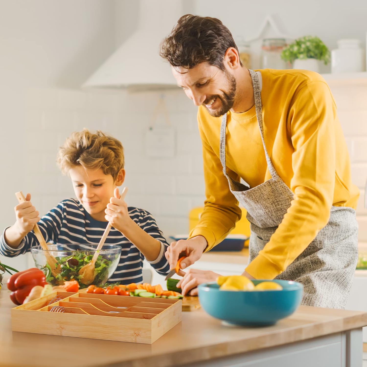 - 【Made of natural bamboo】Our flatware organizer is made of natural bamboo. The material is taken from bamboo that have grown for more than 4 years which make our silverware holder for drawer use a durable kitchen piece that ll last you for years. The Environmentally material keep our flatware & utensil water and odor resistant. Even the knife won't leave scratch on it.
