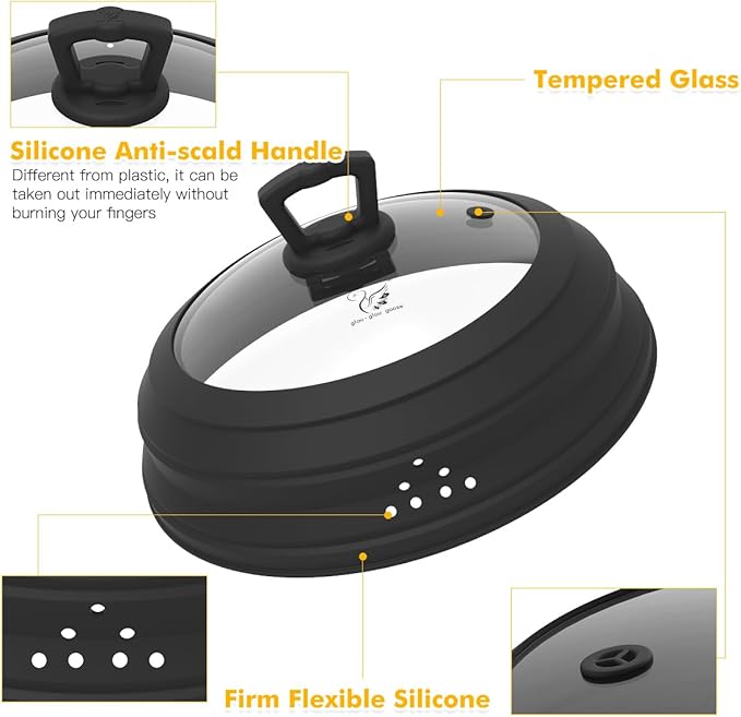 Microwave Splatter Cover Vented Glass Guard Lid with Collapsible Silicone for Food as Pot Cover 11.8 inch Large Plate for 6 7 8 9 10 11 inch Plate Bowl