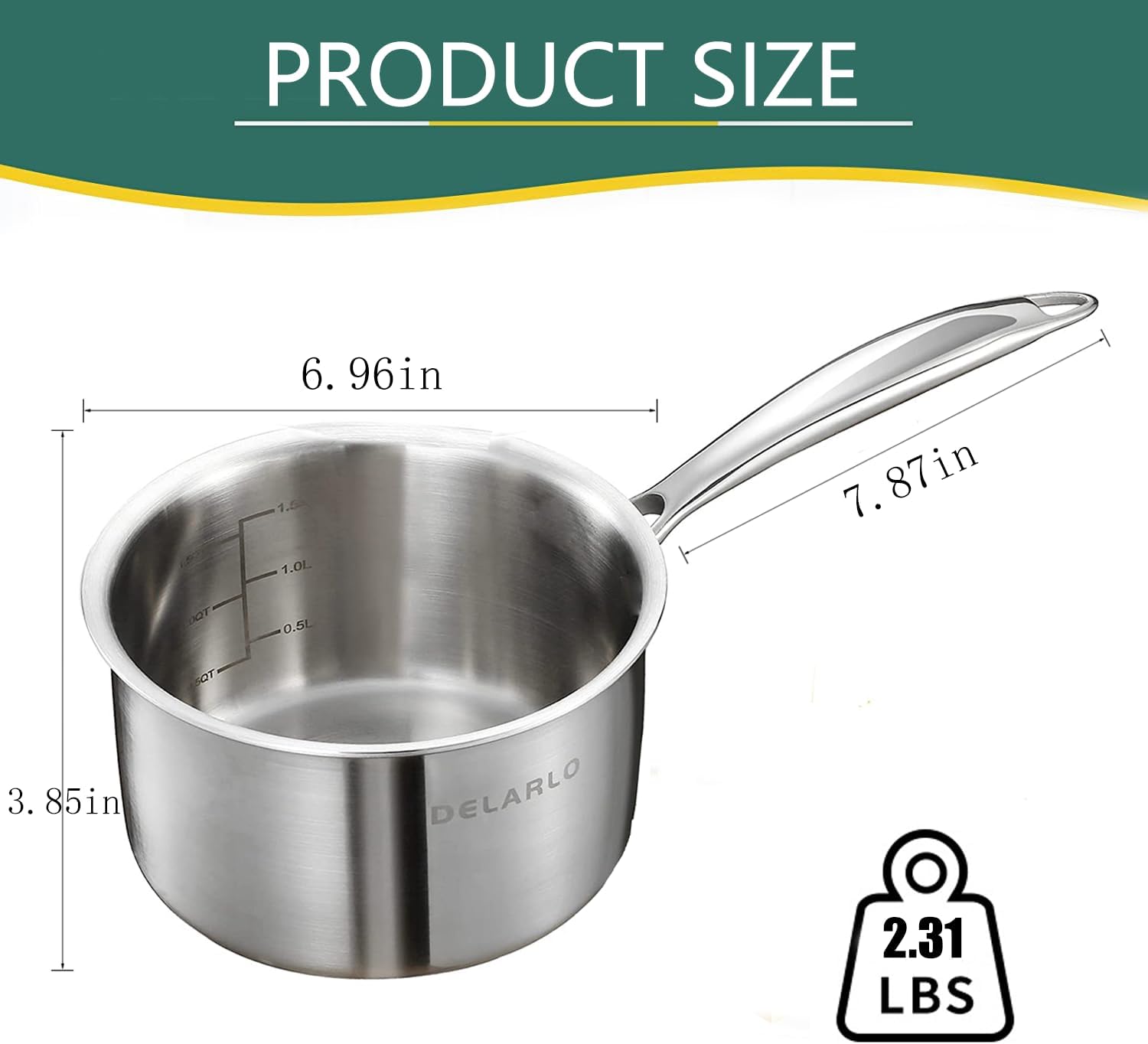 - Delarlo Whole Clad Tri-Ply Non Stick Sauce Pan with Lid's Metal Construction Combines Food Grade Stainless Steel with an Aluminium Core and Outer 18/0 Stainless Steel, Creating a Permanent Bond That Enables Heat to Pass Through the Entire 2.0QT Non Stick Pots - Along the Bottom and Up the Sidewall, Ensuring Fast and Even Heat Distribution for Maximum Cooking Performance. Triply Stainless Steel can Help Save Fuel by Up to 20%, Value for Money