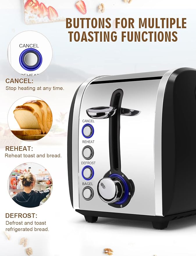 - 🥯【EXTRA-HIGH LIFT & ANTI-STICKING】 Due to EXTRA-HIGH LIFT, you can manually pull up the lever after the bread pops up, letting you take out the bread easily. Safety is the most important thing we concern about. An Anti-sticking design guarantees the 2 slice toaster can stop toasting automatically when time is finished no matter the bread is stuck in the toaster or not. Which prevents the toaster from overheating and offers you safety.
