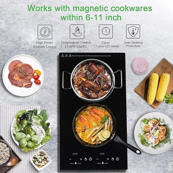 - Compatible Magnetic Cookware:GTKZW 110v electric cooktop two burners built-in works with magnetic induction cookware which the iron content is more than 30% like cast iron, iron, steel, and enameled iron cookware; Suitable for magnetic cookware within 6-11 inch. If no cookware is detected in 30 seconds, the induction burner will turn off automatically.