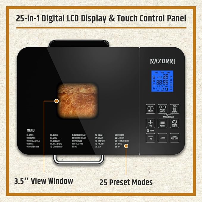 - 25 Presets and DIY Functions: 25 preset programs for all kinds of bread to fulfill your daily diets, including basic kinds bread, dessert, and single function for knead, defrost, ferment and bake, etc. And you may also customize based on your favorite taste.
