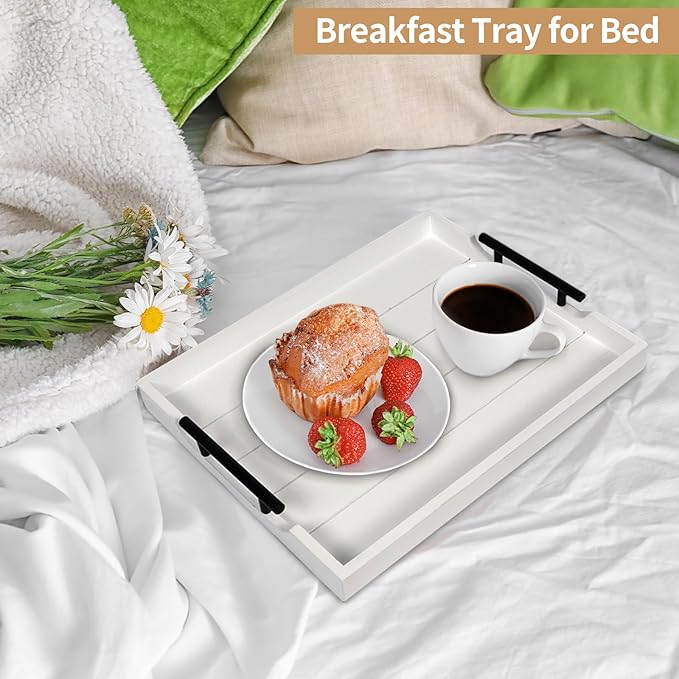 - 【NATURAL RUSTIC YET STYLISH TRAY】What a large white wooden serving tray with handles you would get! Acted as a coffee table tray for serving snacks and dessert, a large wood ottoman tray for breakfast, and Modern, Rustic, Farmhouse, Boho, and Vintage home decor styles.