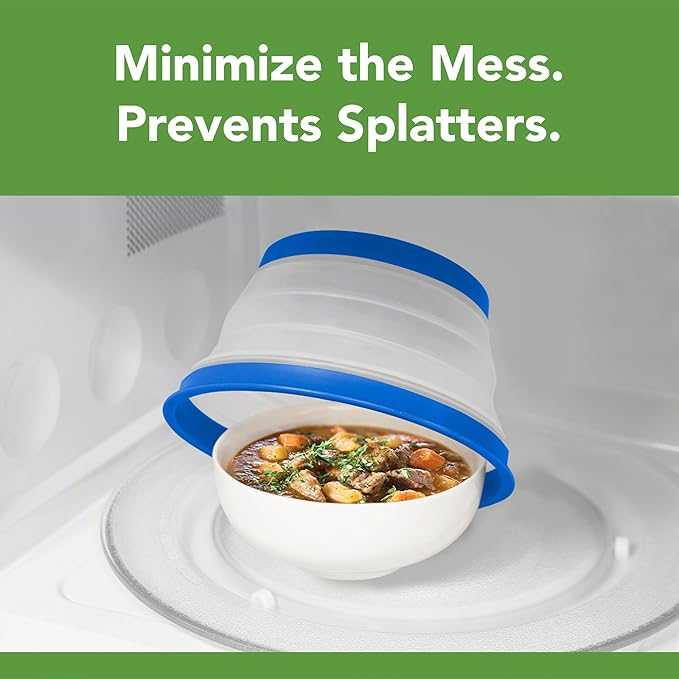 - Collapsible for Easy Storage: This collapsible cover pops up to 3" to cover tall dishes, piles of food, and shallow bowls. The cover collapses to 0.75" for easy storage. Cover can also be used flat to cover large bowls to prevent splattering.