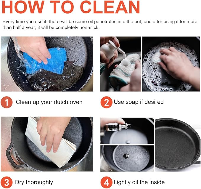 - 【CARING TIPS】- Once you are done cooking make sure to dry completely after cleaning and, while the pot is still warm, lightly oil the inside with your cooking oil of choice. A super-thin coat is all you need.