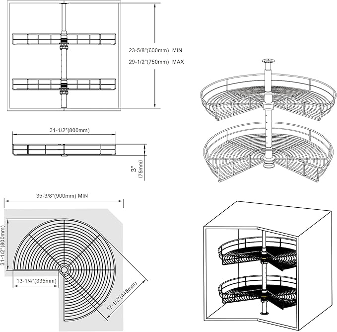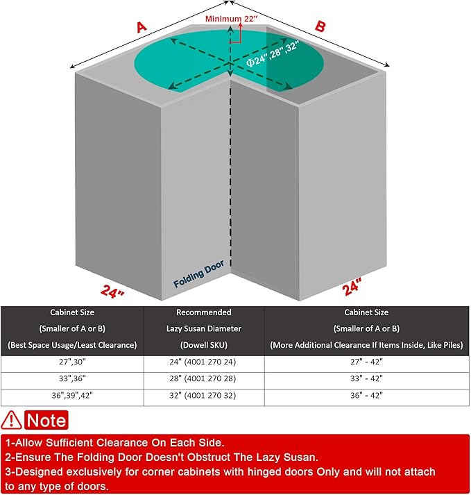 - DESIGNED FOR BASE CORNER CABINETS: Each shelf is kidney shaped (also called pie shaped or 270 degrees) in order to fit easily inside a base corner kitchen cabinet with a hinged diagonal door. The actual diameter of the lazy susan is 32" so the ideal cabinet size is 36" with an internal clearance of 39-42". No part of the lazy susan will attach to the door. Final assembly must be completed inside the cabinet to ensure fit.