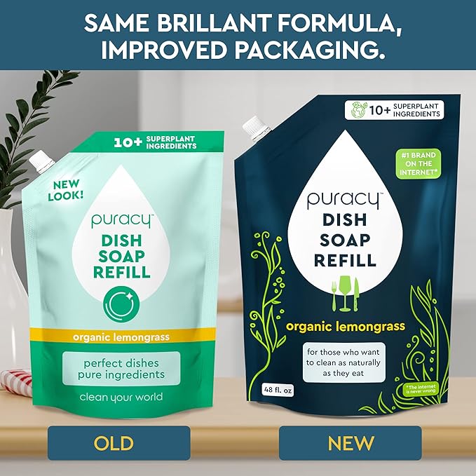 Puracy Natural Dish Soap Refill - Skin-Softening Plant-Based Liquid Dishwashing Detergent Soap, Clean-Rinsing Water-Sheeting Formula (Organic Lemongrass, 48 fl oz)