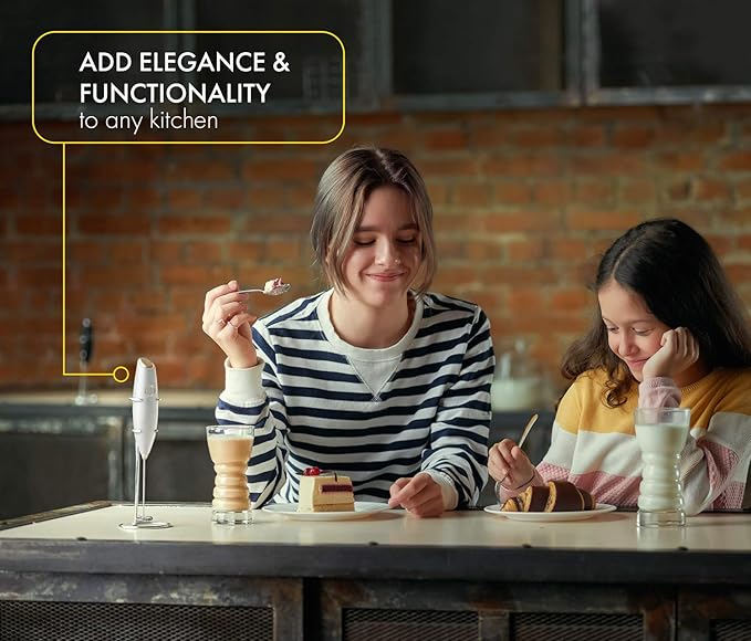 Milk Frother White - Coffee Frother Handheld with Electric Whisk - 19000 rpm - Book Recipes and Stainless Steel Stand Included - Hand Mixer Electric (White and Gold)
