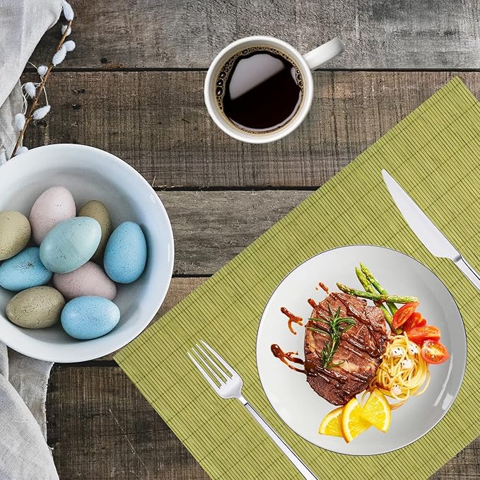 - 【SIZE & MATERIAL】:Each table mat is 17.7"X11.8"(45cmX30cm),set of 8,made from 100% natural bamboo, smooth polishing, environemtally friendly, washable, reusable.Placemats are constructed with round sticks of bamboo. These are similar in construction to sushi rolling mats, and may be used as such.