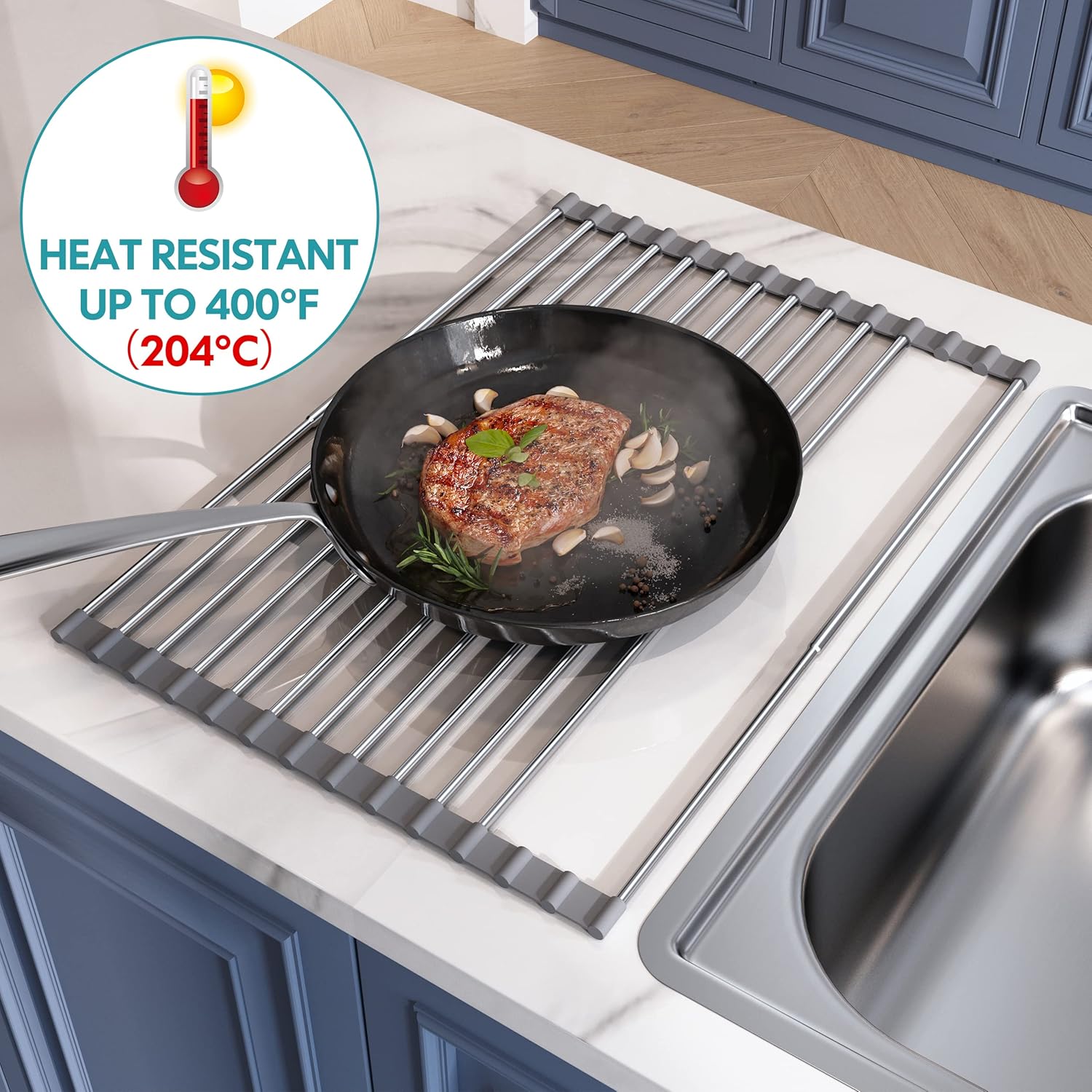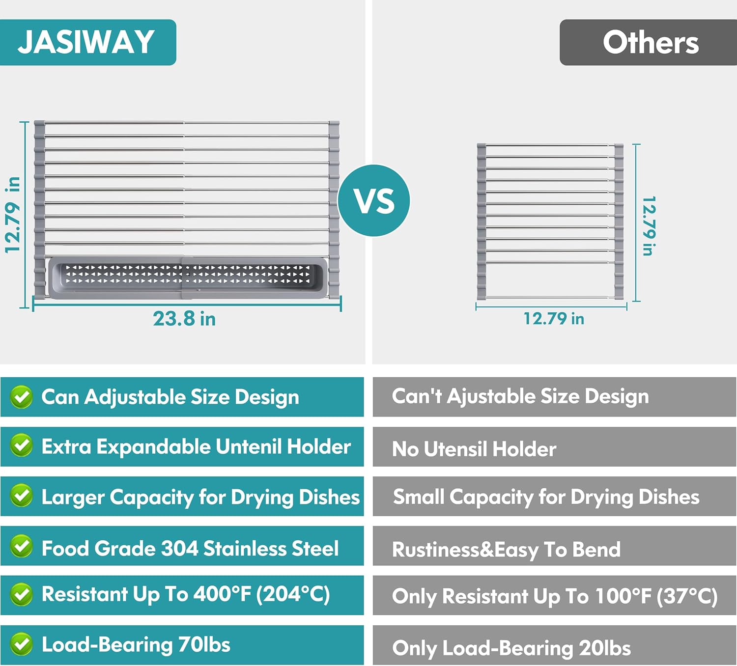 JASIWAY Roll Up Dish Drying Rack, Expandable (12.8"-23.8" D x 12.8" W) Stainless Steel Portable Drainer for Kitchen Sink Counter, Foldable Over The Sink Cover with Removable Utensil Holder