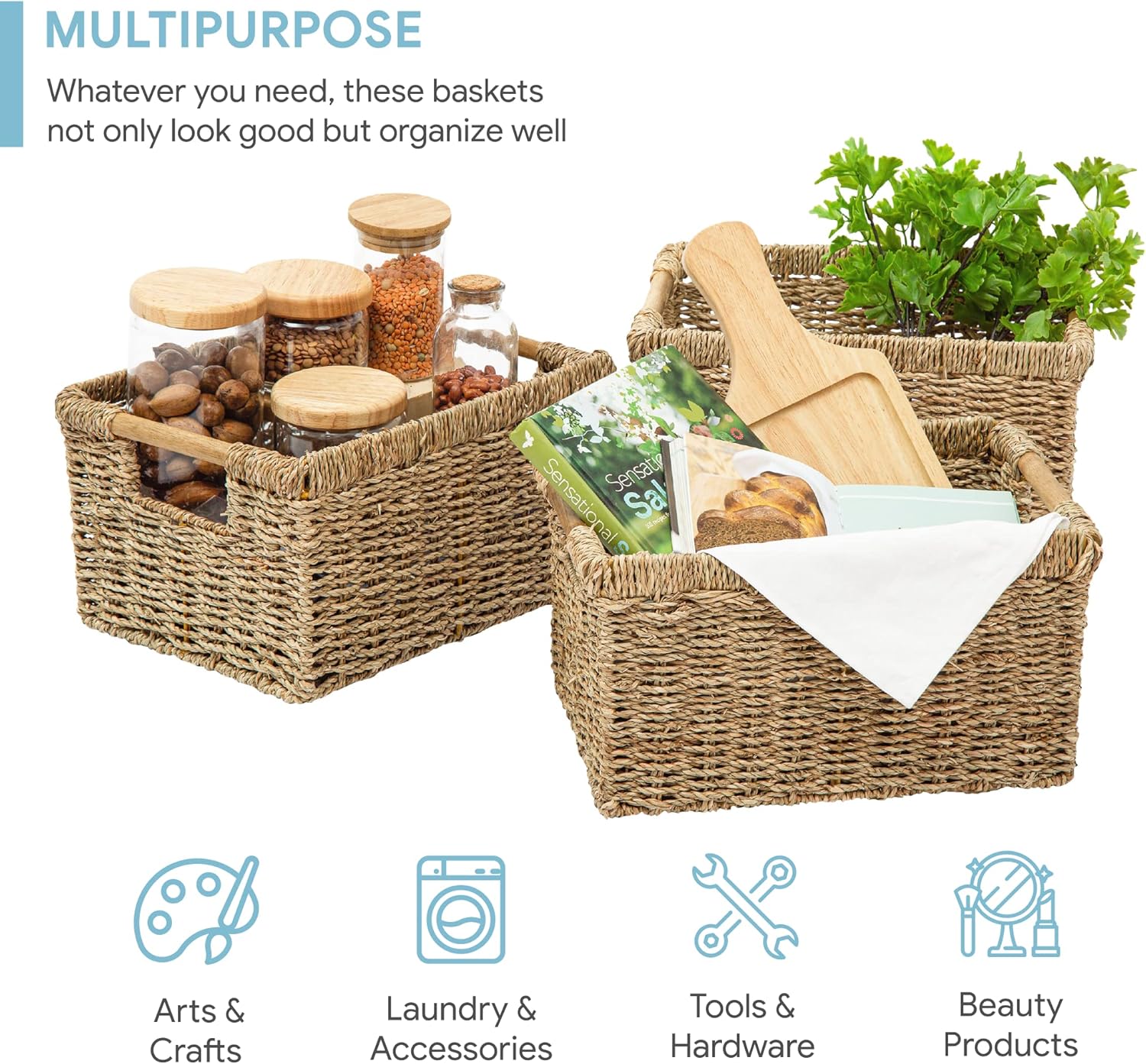 Natural Seagrass Basket with Wooden Handle, Medium Rectuangular Wicker Basket for Living Room 12.2 x 8.9 x 6.7 inches - 3 Pack