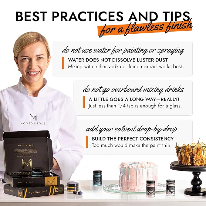 - EASY TO USE: Our orange luster dust is incredibly versatile. Apply with a wet brush, airbrush, or dry brush, and even mix into beverages. Achieve professional-looking results effortlessly at home, whether decorating halloween cakes or adding shimmer to cocktails.
