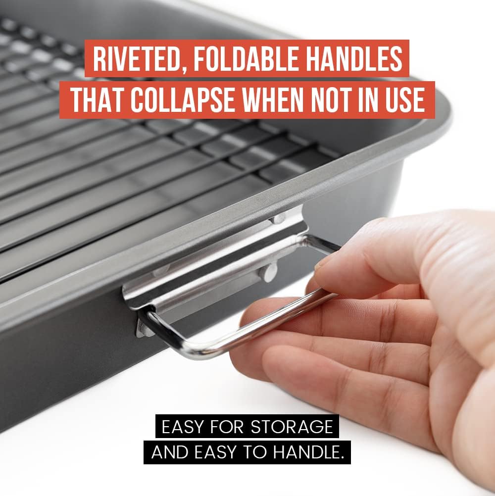 - β MADE FROM HEAVY-DUTY CARBON STEEL: The design of our large roasting pan features sturdy, foldable, securely riveted handles. The strong wire rack can hold up multiple servings of food while allowing consistent heating. Roast turkeys with all the stuffing even ease!