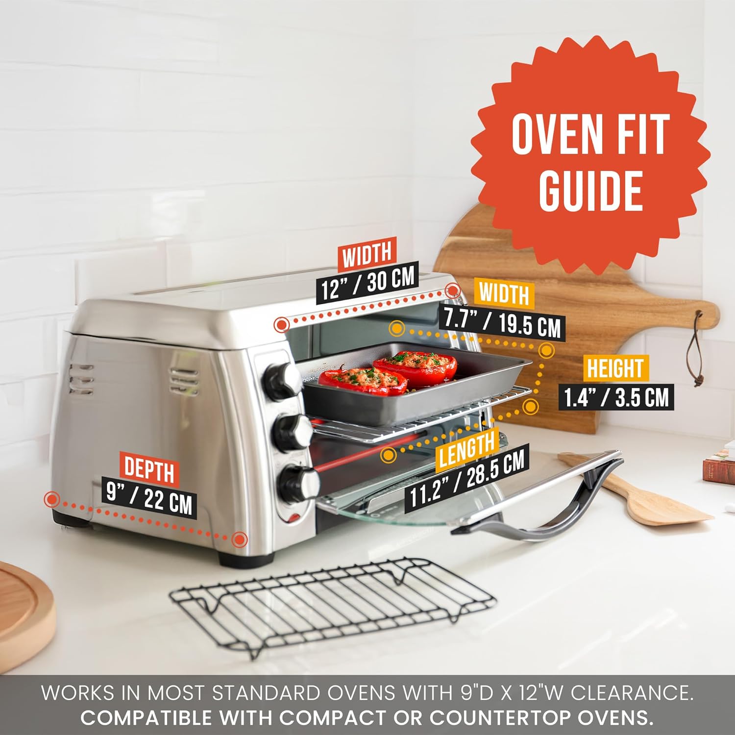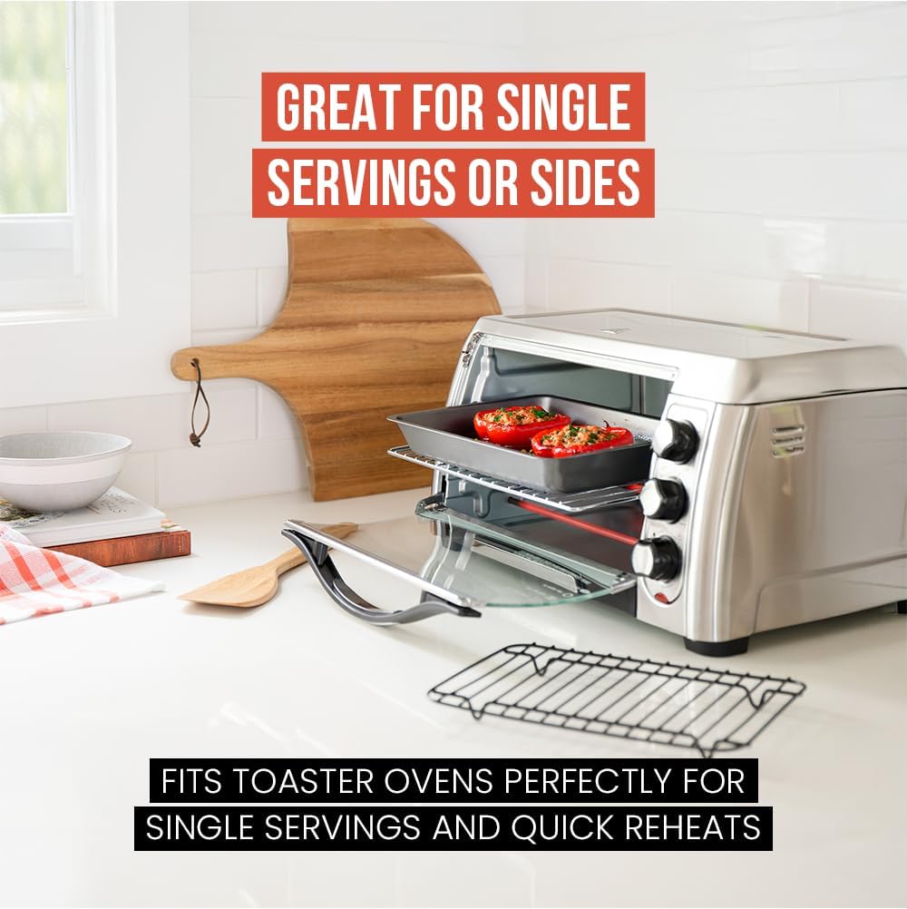 - SMALL PAN ROASTER WITH FLAT ROASTING RACK: Designed to fit small countertop and toaster ovens, this mini version of our turkey roasting pan with rack is perfect for snappy, convenient recipes or intimate dinner preps for up to two people.