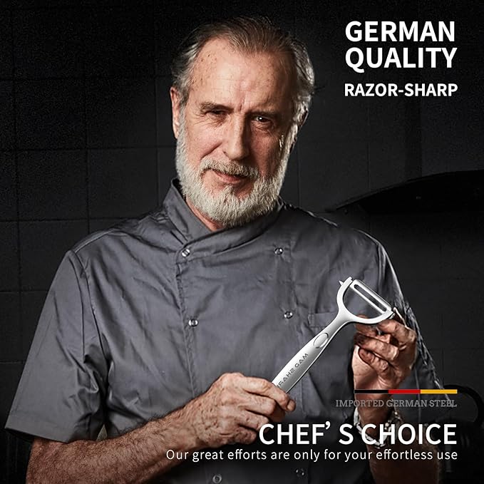 - Super Sharp Vegetable Peeler: MAD SHARK Peeler uses upgraded 304 stainless steel serrated rotating blade and zinc alloy body to ensure no rust. Compared with traditional peelers, our blade thickness is increased to 1mm, which is twice the thickness of traditional blades. The blade and body are reinforced, making the blade sharper, more durable and less likely to fall off
