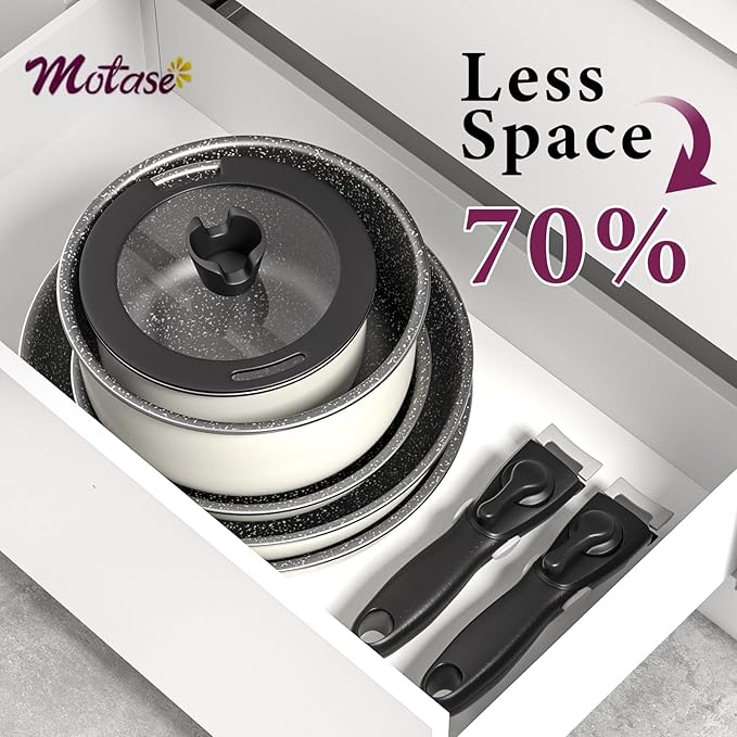 - For a Clutter-Free Cupboard: Optimal storage and easy stacking with the handles off saves up to 70% more space of Motase detachable handle pots and pans set.