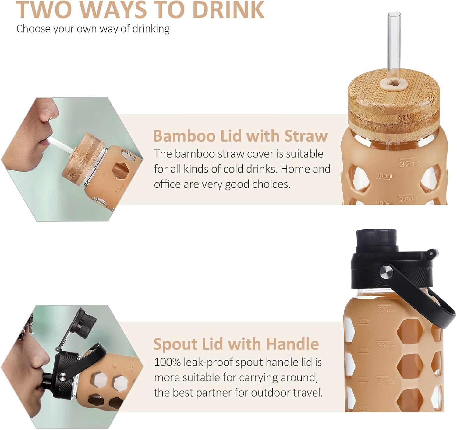 - TWO LIDS DESIGN:Natural bamboo straw lid and leak-proof spout handle lid -The bamboo straw lid makes sipping more effortless, allowing for easy hydration throughout the day whether you're at the home or office.-The spout enables smooth liquid flow and the handle attached to the lid allows for easy carrying on the go.Suitable for gym and outdoors.