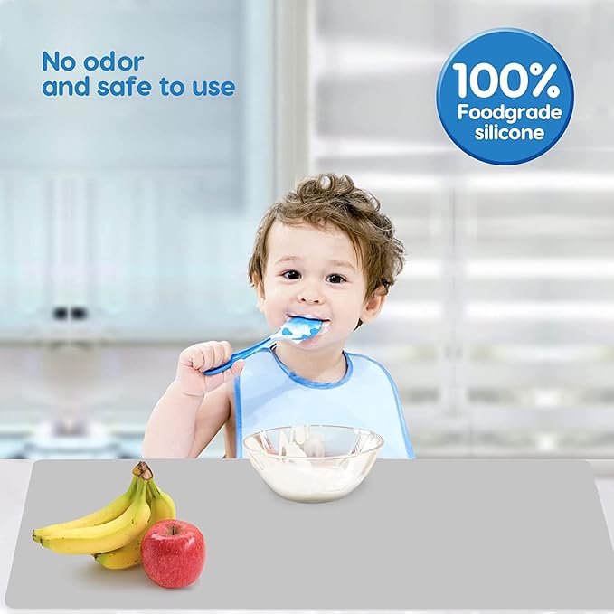 - 【WATERPROOF & ANTI-SLIP】: The smooth side face up be suggested, as it is not sticky and very easy to clean. Heat resistant silicone mats can be wiped directly with a rag and be washed with soapy water. Spilled resin/glue/paint solidification can be peeled off straightly. We suggest the side with particles face down, as the particles could hold the flat surface tight and helps contain the mess your kid makes from eating or playing.