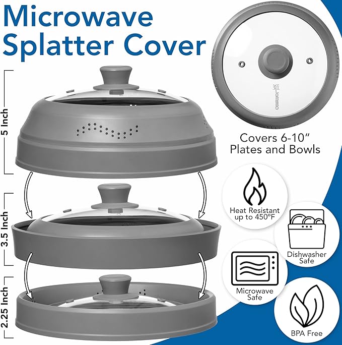 - Collapsible Silicone Dome – A unique design that makes it easier to cover all types of different dishes 6” to10” in size our microwave splatter-proof cover is made with a flexible, heat-resistant silicon that’s BPA free and offers food grade versatility.