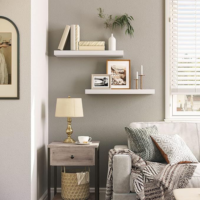 - High Quality: Sized in 23.6"L x 7.9"W x 1.5"H. The 1.5" thick floating shelves for wall are fixed with Invisible and enhanced dual-pipe iron Brackets, stable with great load up to 22 lb per wall mounted shelf