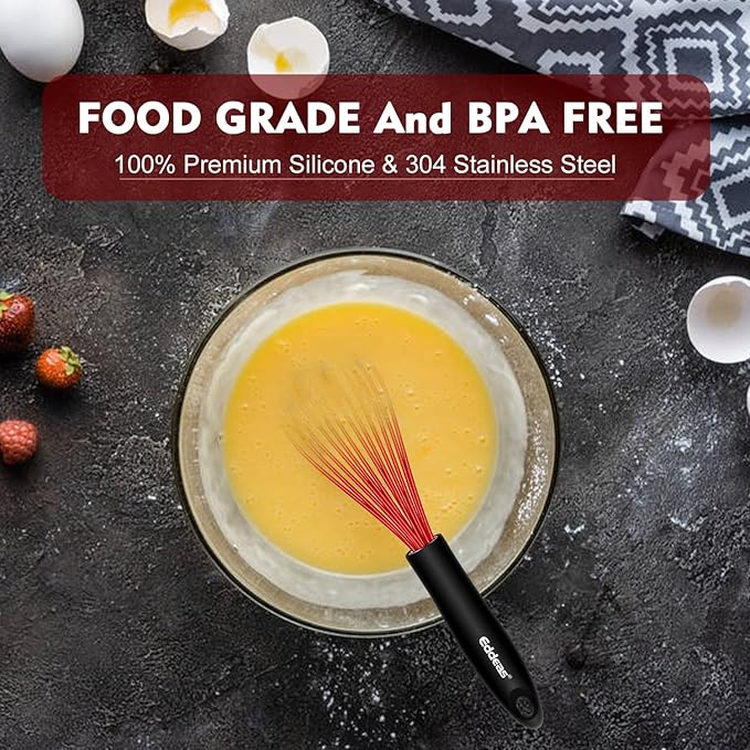 Silicone Whisk, Eddeas Stainless Steel & Silicone Non-Stick Coated Whisks set of 3-Heat Resistant (450°F) Kitchen Whisks Perfect for Blending, Whisking, Beating & Stirring, Red