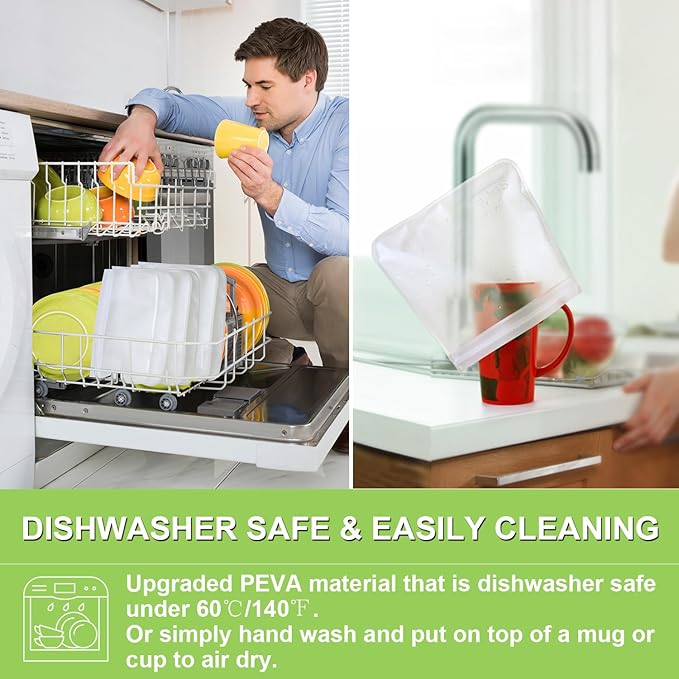 - Freezer Safe & Dishwasher Safe: The freezer bags can lock out freezer burn while keeping food fresh and full of taste, perfect for freezing meat, chicken, fish, fruits and vegetable. Upgraded PEVA material that is dishwasher safe under 60β/140β. We suggest alternating hand wash in water and air dry to clean for long-term usage. Not microwave friendly.