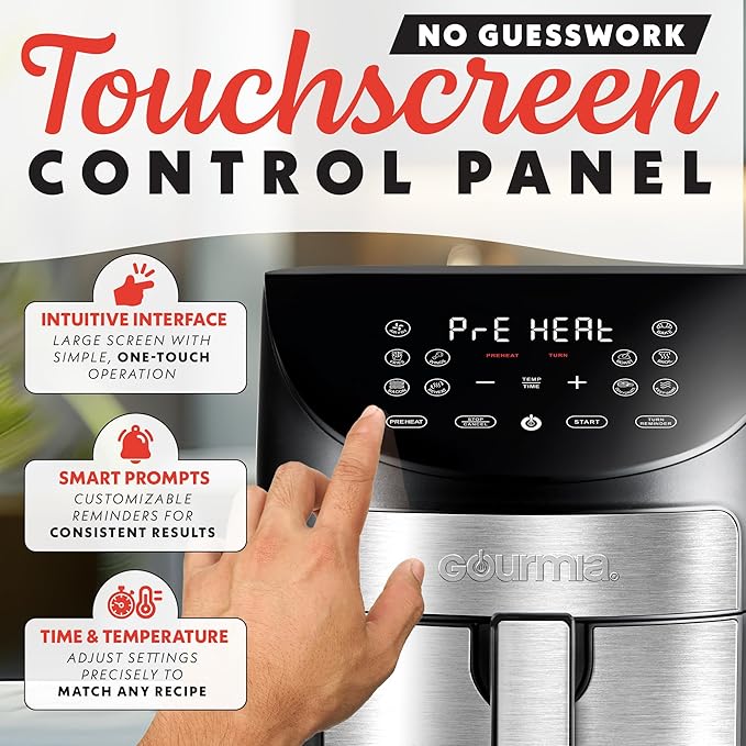 Gourmia Digital Air Fryer – 7 QT, FryForce 360° Technology, 10 Presets, Guided Cooking Prompts, Auto Shut-Off, Dishwasher Safe Basket, 1500W, black/Stainless Steel