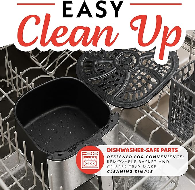 - Easy Cleanup Convenience – Nonstick seven quart basket, crisper tray, and multi-purpose rack are all dishwasher safe for quick, mess-free cleanup