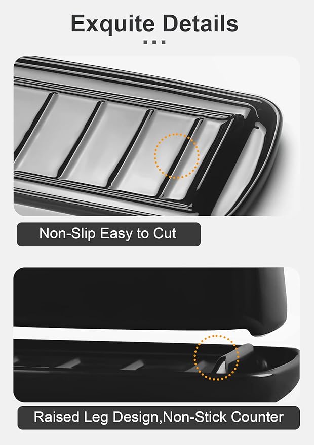 - ๐ฐ Easy Scoop And Clean: The black butter dish raised non-slip strip and curved ramps on both sides help you easily scoop up butter. The top of the ramp act as a scrape plate to clean your knife and collect butter.