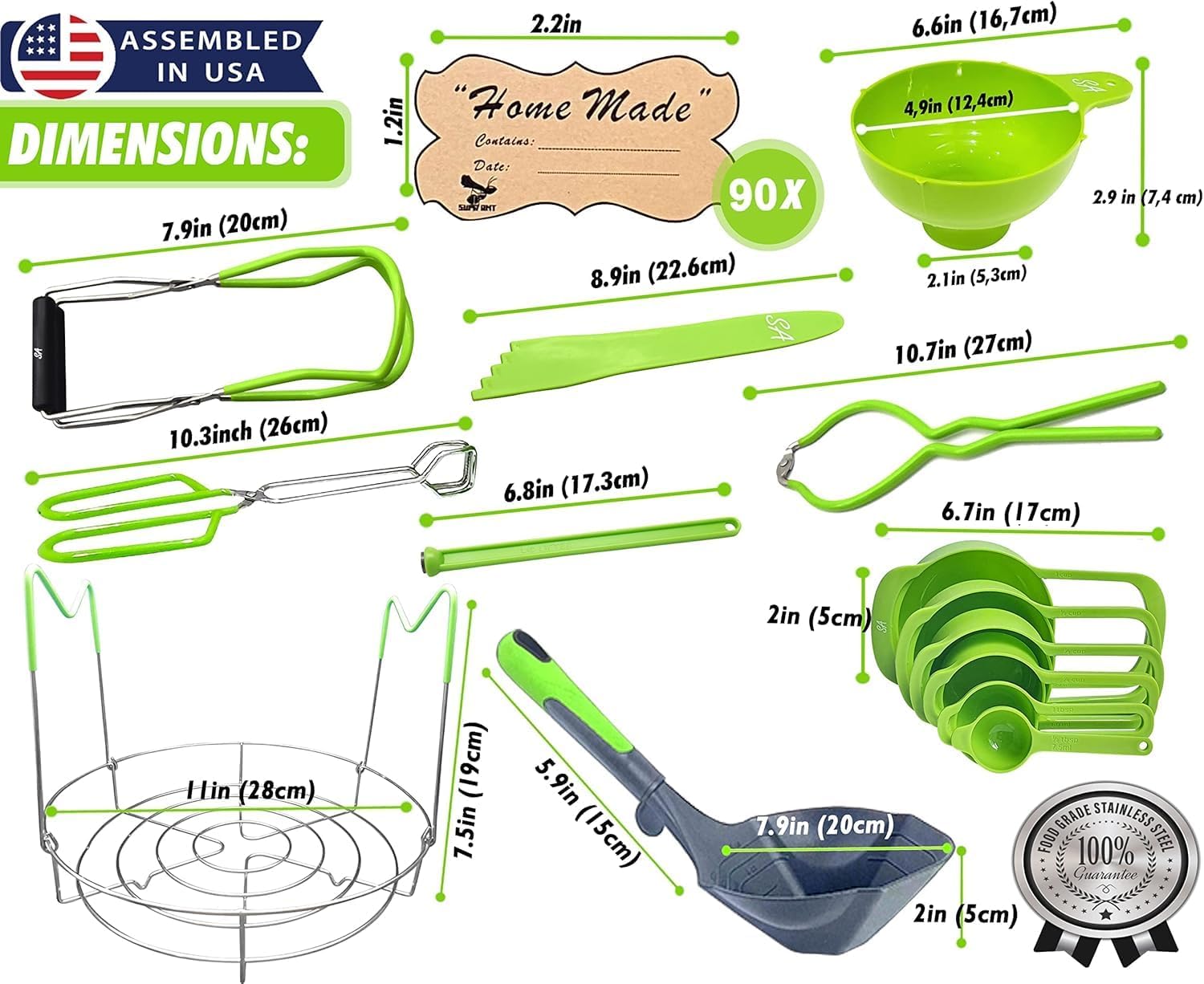 - All-in-one canning supplies: This home canning kit consists of all essential tools: canning funnel, jar lifter, bubble popper (measurer), magnetic lid lifter, jar wrench, canning tongs and a set of "Home made" labels to remind everyone of the hard work you have put in to make it :)