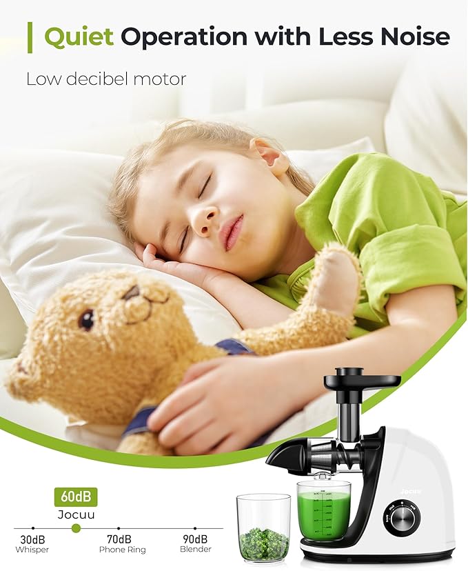 - Safe and Silent Operation: The slow masticating juicer with a small feeder chute prevents kids from getting injured when extracting the juice and also helps remove seeds to reduce its bitter taste. Additionally, the juicer runs on a 60 dB low-speed silent motor and offers quiet operation