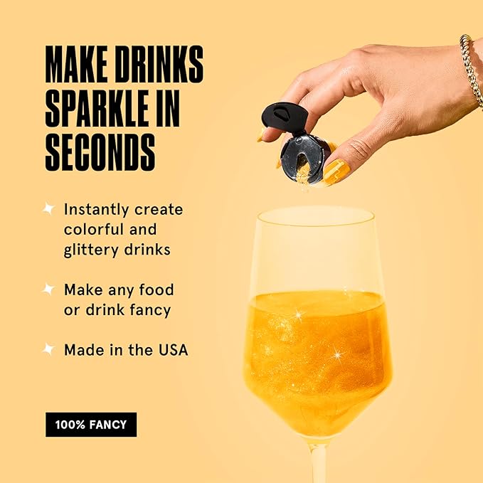 - GLITTERY FOOD & DRINKS: Fancy Edible Glitter is a fine prismatic powder formulated for both food and drink. Add edible glitter to still and carbonated beverages and spirits to create a glittery hurricane, or dust onto desserts and savory items for a sparkly finish.