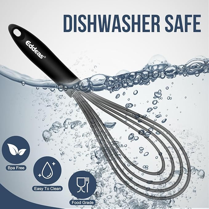 - POWERFUL FEATURES -EDDEAS silicone flat whisk is heat resistant up to 450 degrees F. Perfect for whisking eggs and whipping up sauces and batters, easy to scrape small amounts of eggs from the corners and sides of the pan, making it a great choice for kitchen baking supplies.
