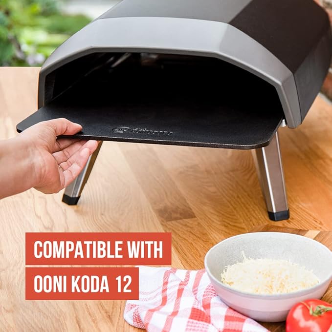 - β VERSATILE COOKING OPTIONS: Our steel bakeware is compatible with pizza ovens such as Ooni Koda 12 as well as standard hosuehold baking ovens and grills. Use it as a baking stone for bread, an outdoor stovetop griddle, or a grilling pan. The carbon steel's consistent heat conduction won't disappoint no matter what you throw at it!