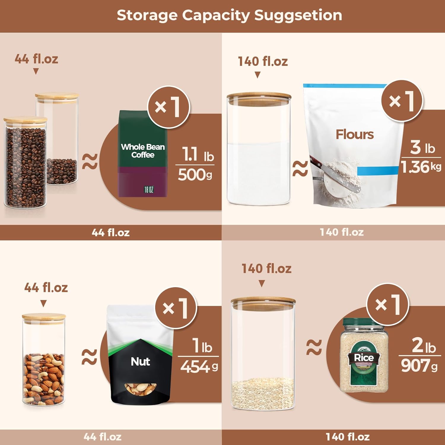 - 2 Pcs Large Capacity in Square Shape: The smaller size measures 8.2 inches x 3.9 inches with a capacity of 44 fl.oz, the larger size, measuring 5.9 inches x 10.6 inches with a generous capacity of 1.1 gallon. Ideal for storing nuts, rice, flour and sugar.
