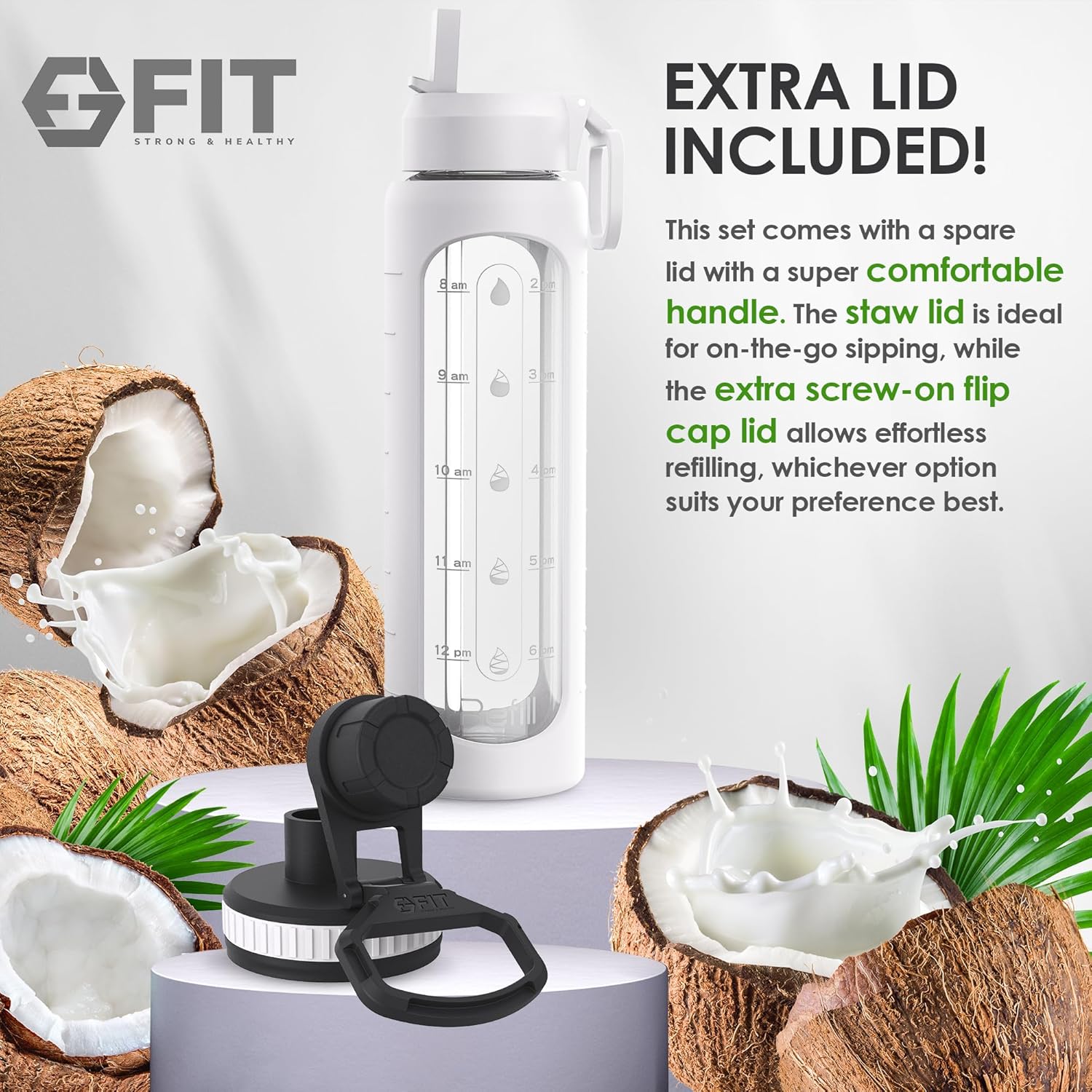 - Extra Lid Included: This bonus lid is designed for versatility and convenience; no worries if you misplace the straw lid; this spare lid ensures that you can continue enjoying your glass water bottle for an extended period of time; the straw lid is perfect for on-the-go sipping, while the extra screw-on flip cap lid allows for effortless refilling or whichever option suits your preference best