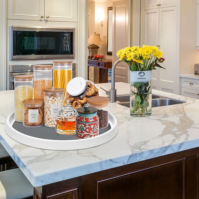 - TURN SMOOTH & NON-SKID -12 inch lazy susan organizer turns smoothly on sturdy stainless steel ball bearings; non-slide on spotted rubber surface and keep bottles and containers in place. This turntable organizer is perfect for kitchen and pantry organization and storage.