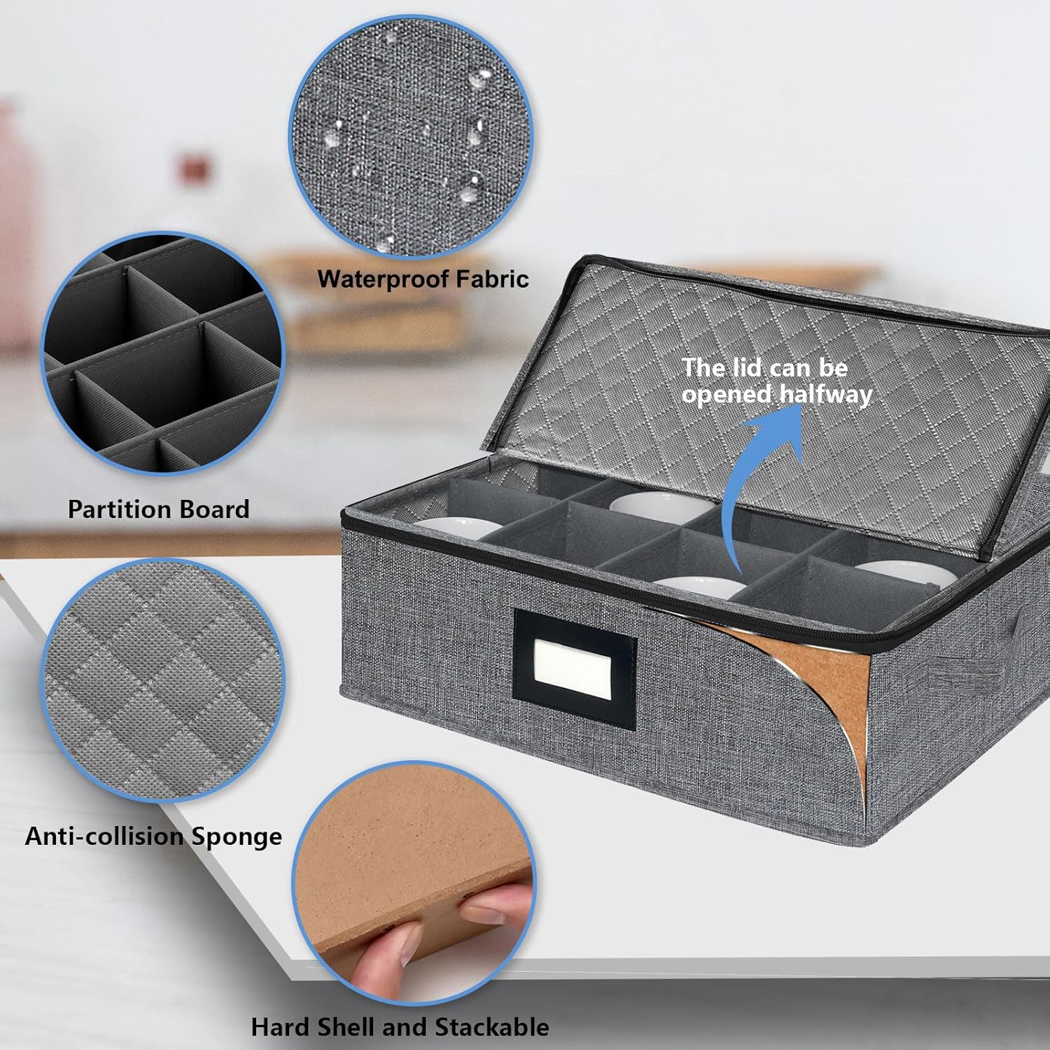 homyfort Mug Coffee Storage Box with Dividers - Stackable Glass China Storage Containers Hard Shell with Lid, Label and Handles, Holds 12 Coffee Mugs and Tea Cups (Dark Grey)