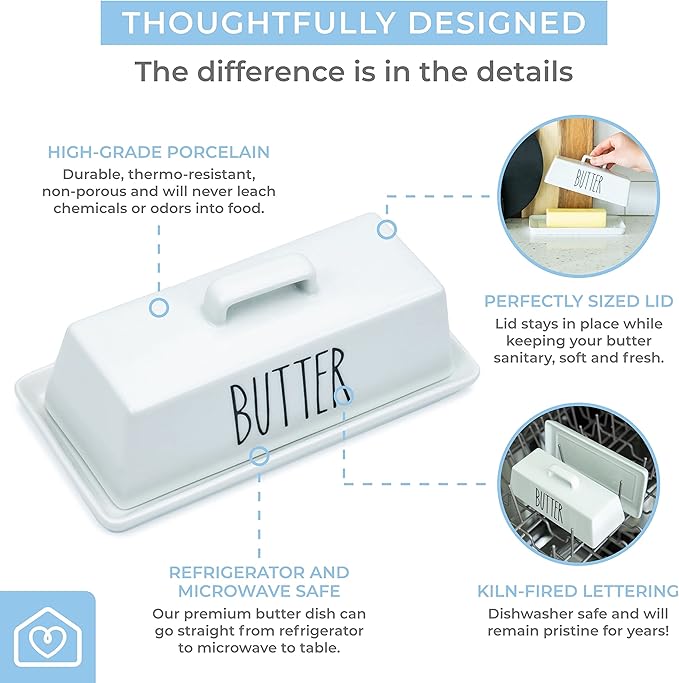 - Velvety Soft, Easy To Spread: The first thing you might notice about this white butter dish with lid is how the butter trays are textured with two “knobs”, and feature a generous side wall. So your counter top butter is always soft, smooth and fresh - and it won’t slide all over your dish as you spread it!