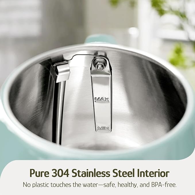 - 【All Stainless Steel】- This retro electric kettle is crafted with food-grade 304 stainless steel in its interior, lid, and filter. It has no plastic in contact with the water, providing you and your family with BPA-free healthy drinking.