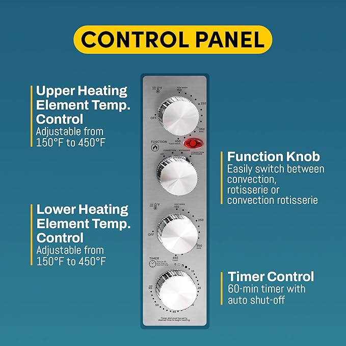 - Independent Temperature Knobs up to 450°F to separately control top and bottom heating elements - turn on only one or both at the same time; 60-minute timer with signal turns oven off automatically