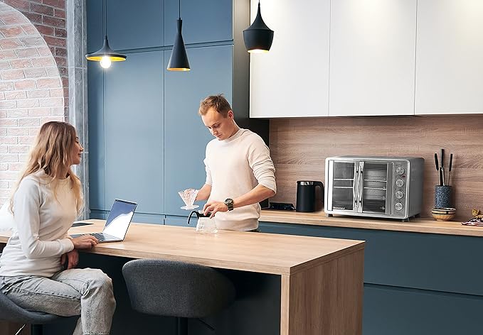 - French dual door design allows you to open one or both doors at a time saving precious counter space. Four rack positions allow you to cook multiple dishes at once