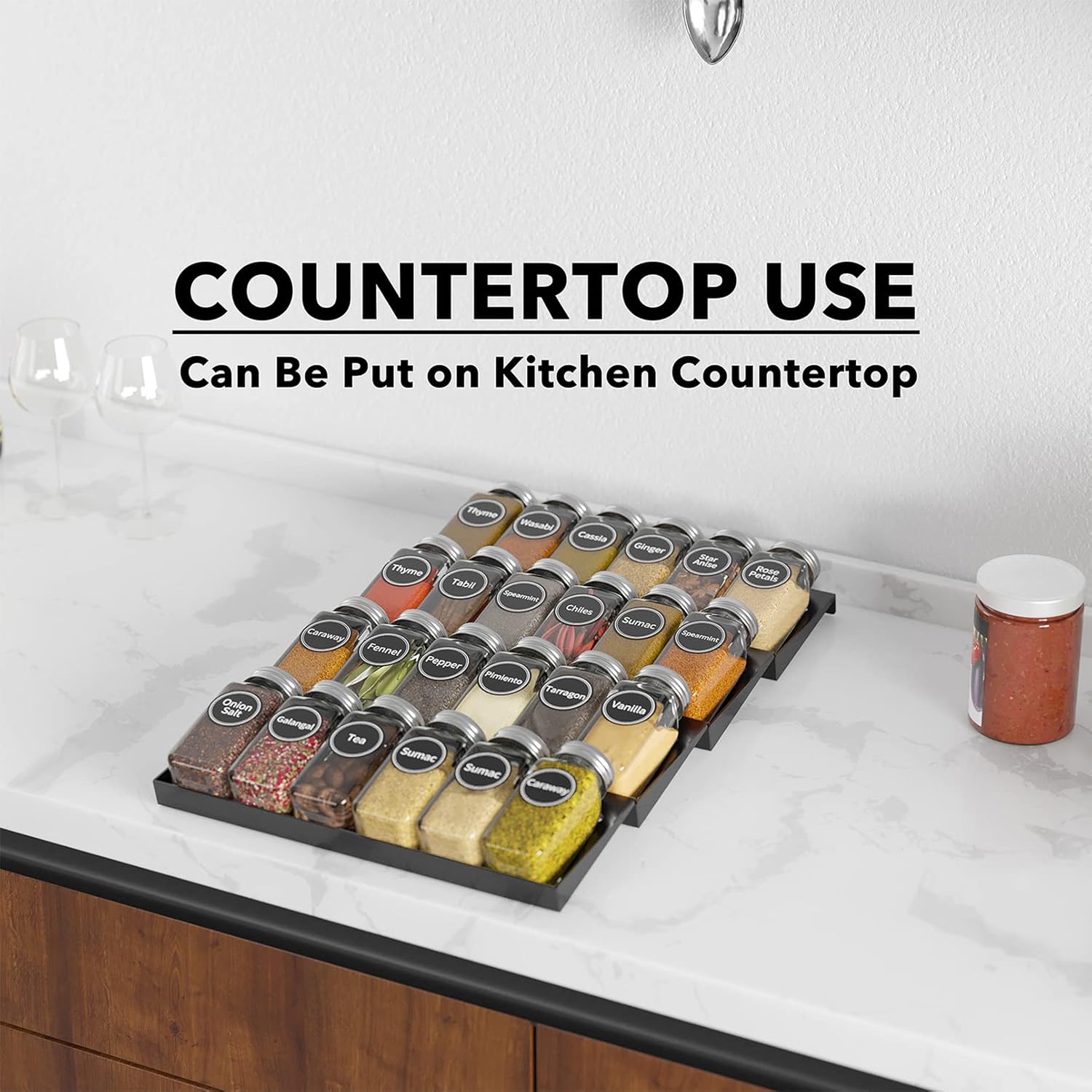 - Complete Drawer Spice Organizer Set: 1 x Drawer Spice Rack, 24 x Square Empty Glass Spice Jars, 386 Spice labels