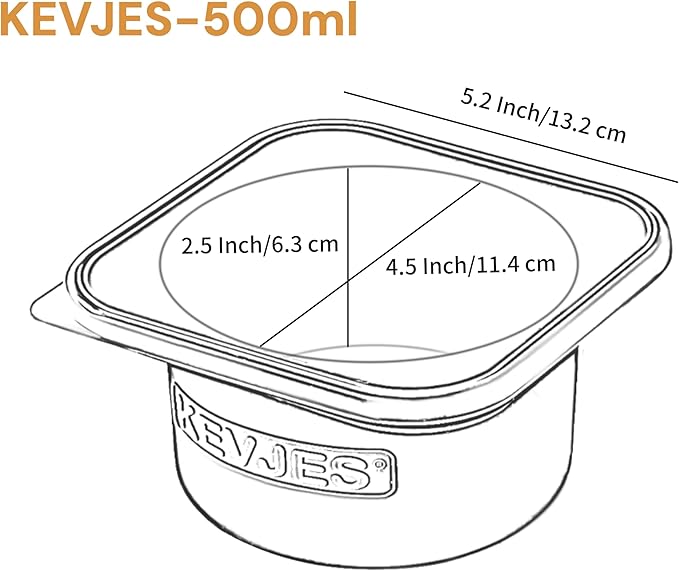 - Dimension of each KEVJES Dough Container is 5.3 x 5.3 x 2.6H inches, volume:500ml.