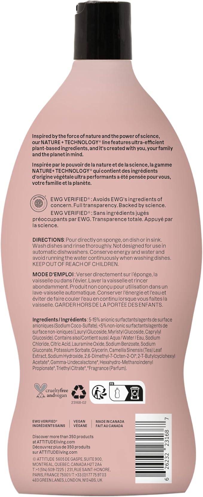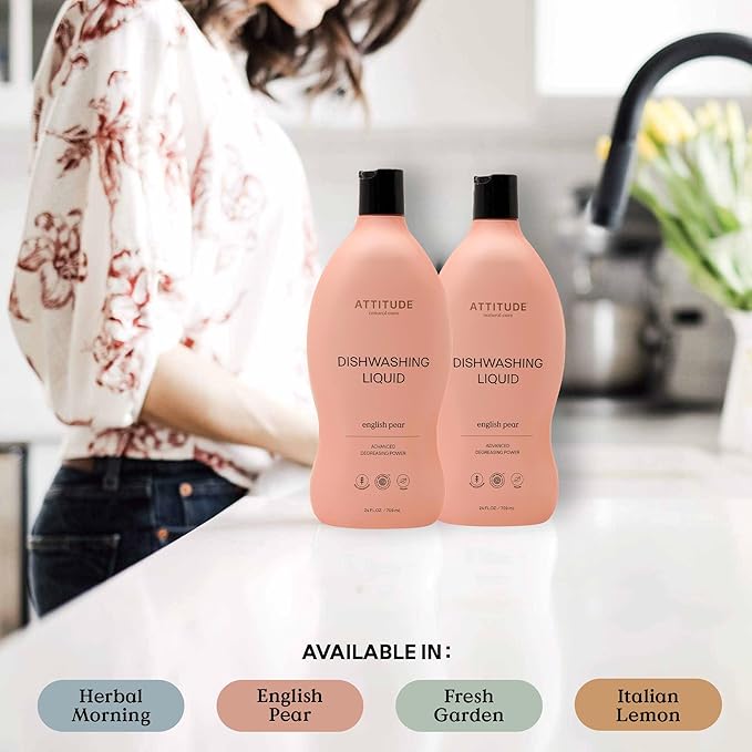 ATTITUDE Dish Soap, EWG Verified, Plant-Based & Vegan Dishwashing Liquid, Naturally Derived, English Pear Scent, 24 Fl Oz