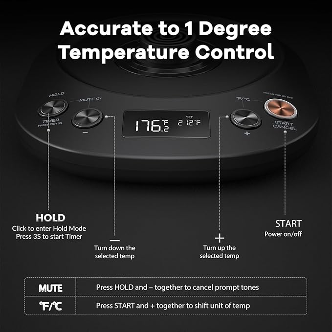 - Accurate Temperature Control and Realtime Display: Built in up-to-date advanced thermostat and 2.0 inch LCD display to show the realtime temperature and set temperature, and other information like hold time, mute mode, heating status, stopwatch. A single glimpse will give you all important parameters