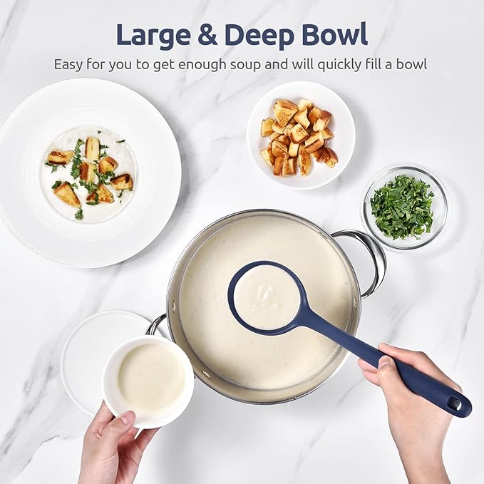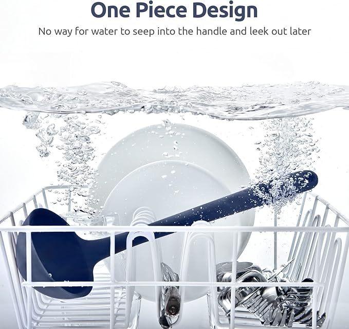 - [600ºF High Heat Resistant] It's made of BPA Free & food grade silicone and handles high heat well. If you forget and leave this kitchen ladle inside a pot of soup while you're eating dinner, it won't melt. You can use this cooking ladle for soups, thick chili, stews, gravy and other foodstuffs and it won't scratch your nonstick pots and pans. Integrated design makes it no small places for food to hide in! Goes through the dishwasher well or it's an easy, quick cleanup in the sink.