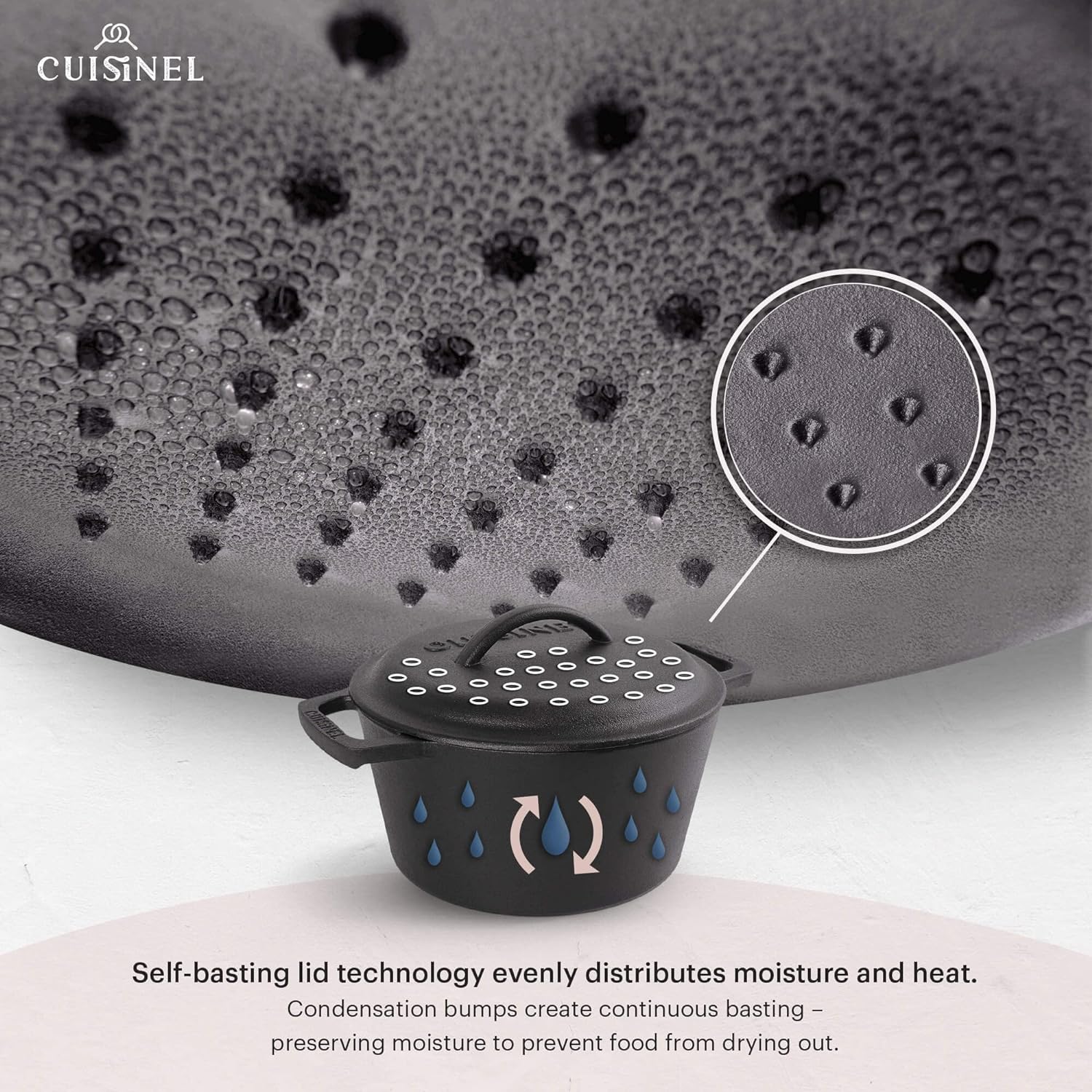 - THE DUTCH OVEN - NOW WITH A HEAVY DUTY CAST IRON BRAISER LID – With its meticulously placed drip-points - along with even moisture and heat distribution - effectively turns your pot into a casserole or braiser for evenly cooked results. Cooker and cover can withstand any temperatures without fear of shattering or cracking.