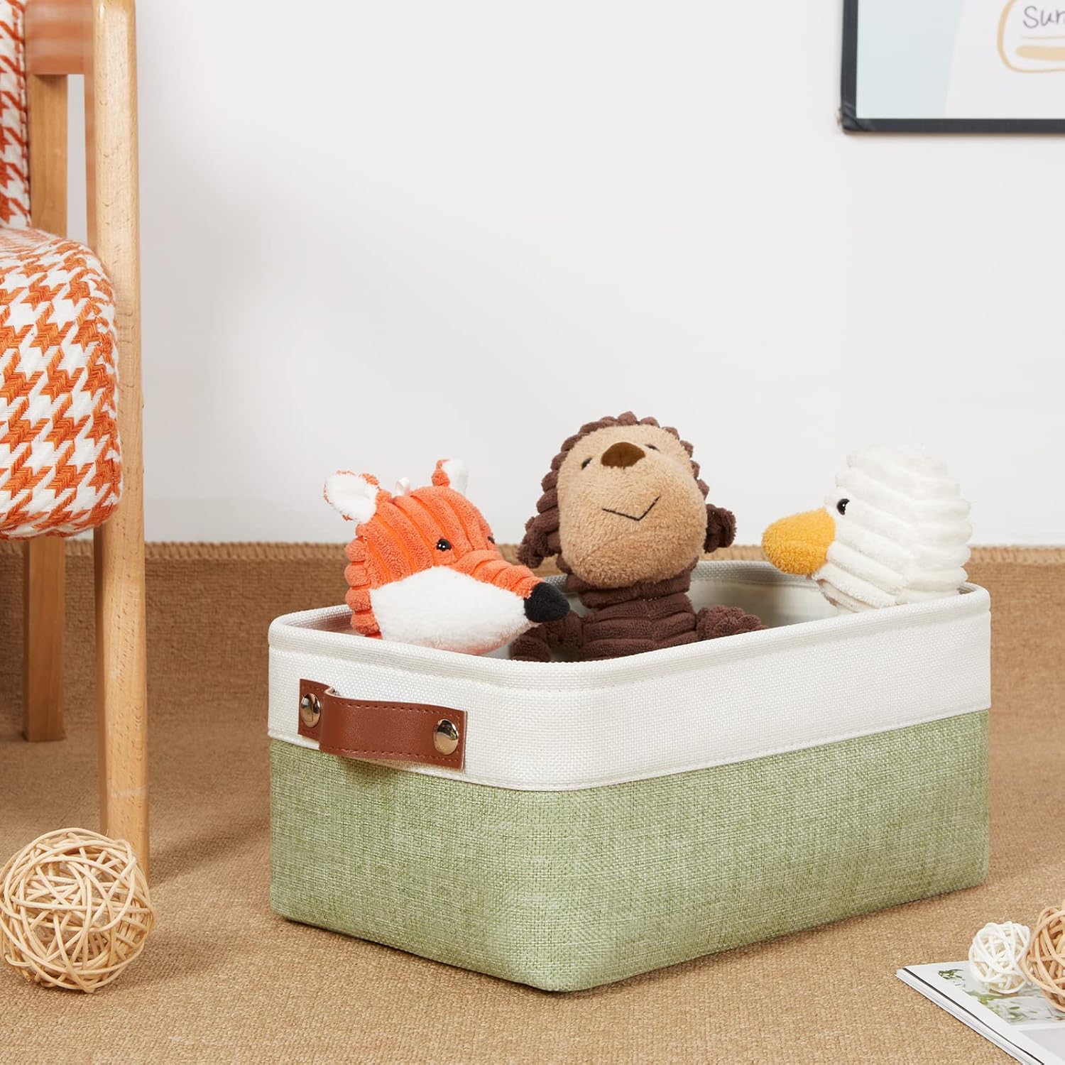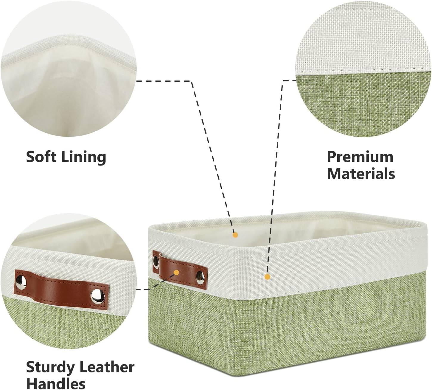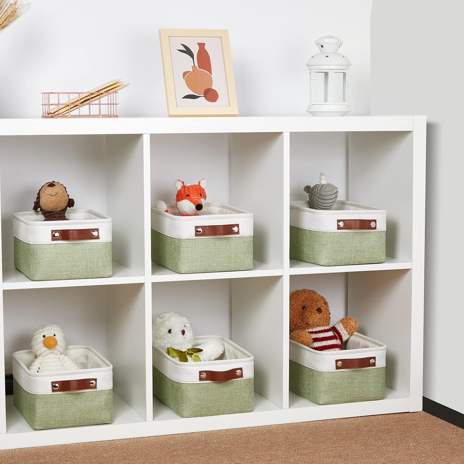 DULLEMELO Storage Baskets for Shelves, Small Fabric Collapsible Rectangular Storage Baskets for Organizing, Closets, Nursery, Home, Office, Empty Gift Baskets (6-Pack, White&Green)
