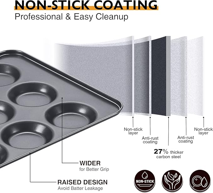 - PREMIUM EXTRA-THICK MATERIAL - With 27% thicker carbon steel, these durable muffin top pans for baking are constructed from heavy-gauge carbon steel for stability, even heat distribution, and durability for years to come. Warranty against peeling off with heat-resistance temperature: 450β.